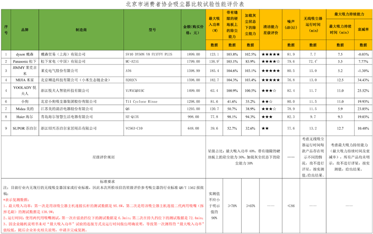 本次比较试验委托中家院(北京)检测认证有限公司对无线吸尘器样品的最大吸入功率、噪声、带有缝隙的硬地板上的除尘能力、无线吸尘器运行时间、最大吸力持续能力、加载灰尘状态下的除尘能力注项目进行了测试。比较试验结果仅对购买的样品负责。