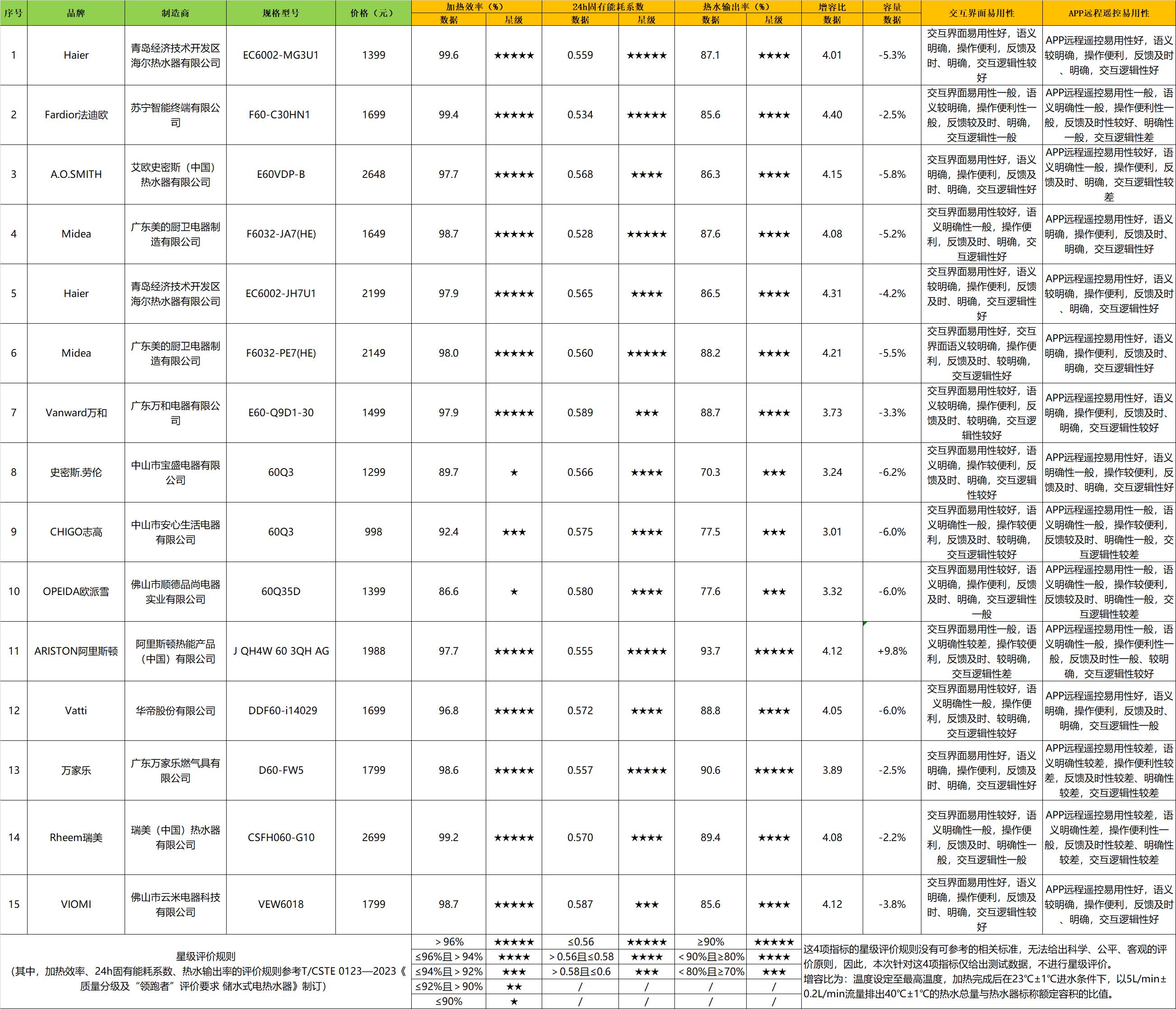 比较试验样品由北京市消费者协会的工作人员以普通消费者的身份从电商平台购买了15个明示能效等级为1级,额定容积为60l,额定功率为(3000~3300)w范围内的产品,涉及13个品牌,购买价格从998元/台到2699元/台。